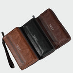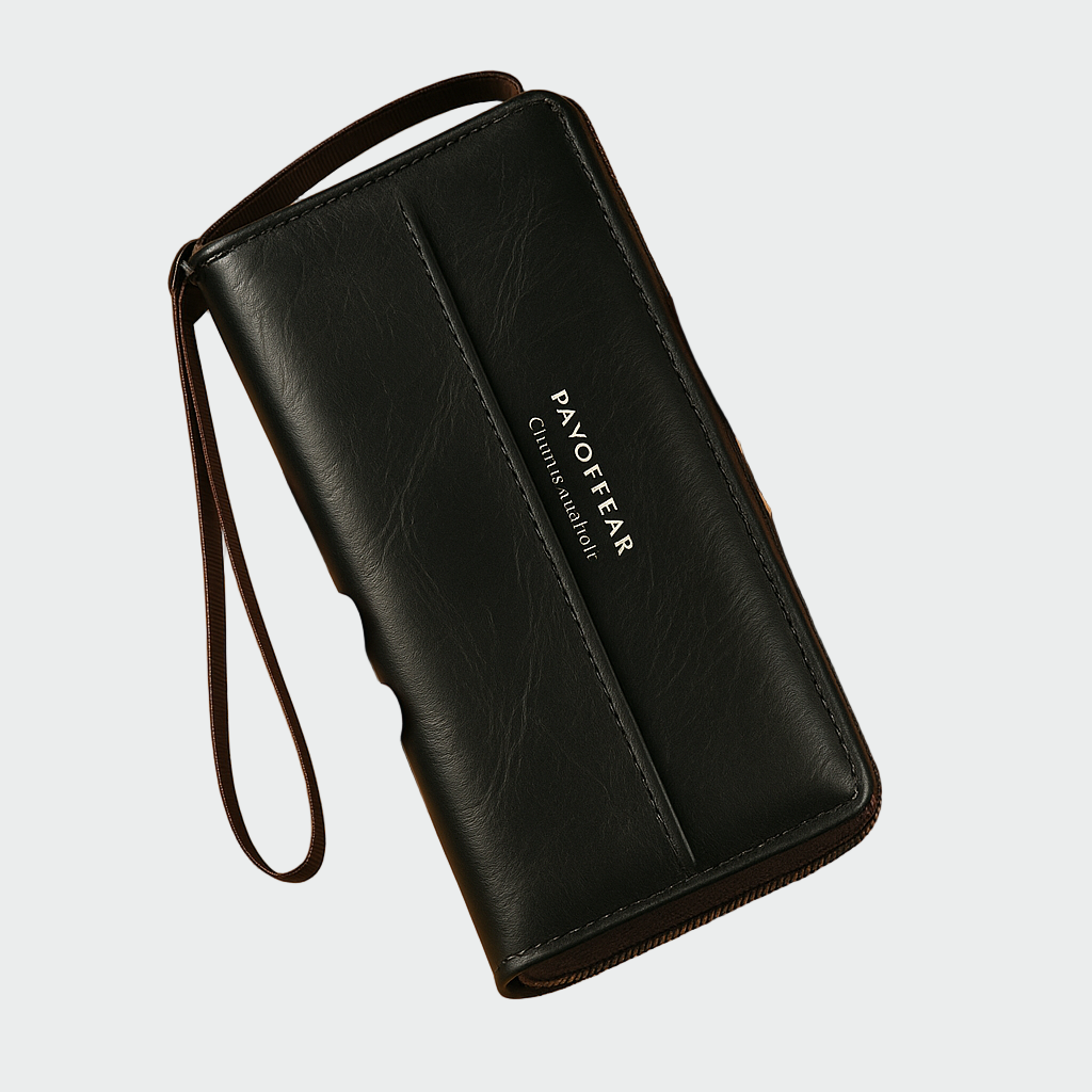 Elegáns férfi pénztárca fekete színben, minimalista dizájnnal és praktikus csuklópánttal a könnyű hordozhatóság érdekében. Számos rekeszt tartalmaz kártyák, készpénz és érmék számára, ami kényelmet és rendszerezést biztosít a mindennapokban. A bőr minőségi textúrája és a diszkrét logó az elülső oldalon modern és kifinomult megjelenést kölcsönöz. Olyan kiegészítő, amely ötvözi a stílust és a funkcionalitást.