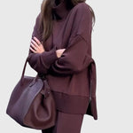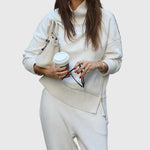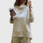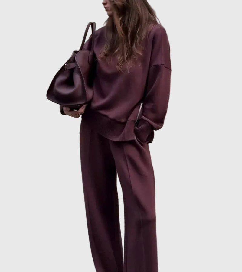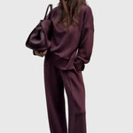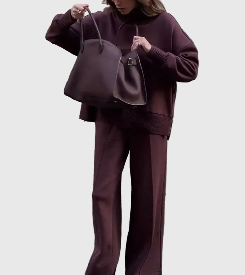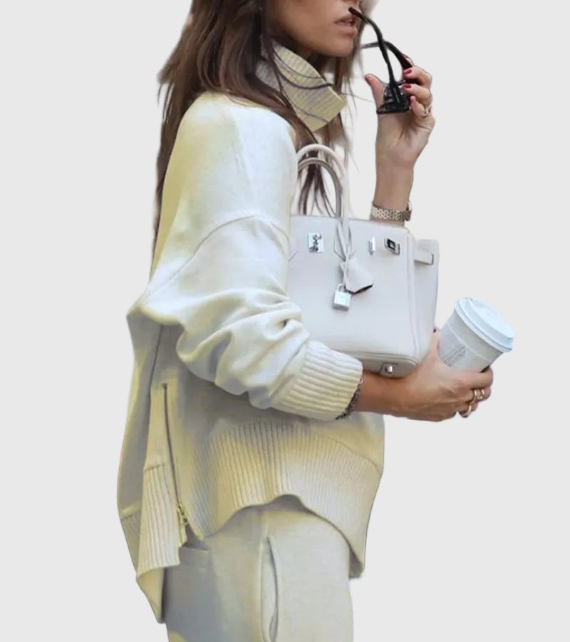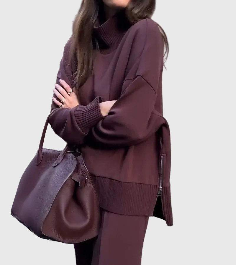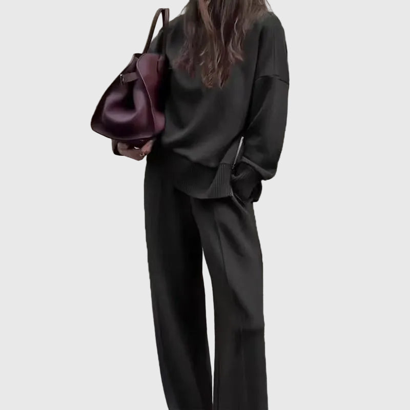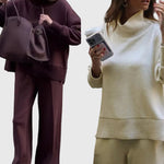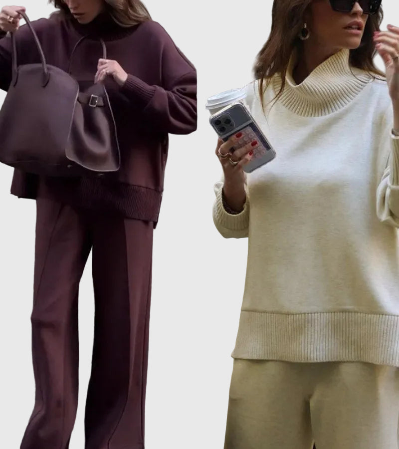 A Juliet Két Részes Szett tökéletes egyensúlyt teremt a kifinomultság és a laza stílus között. Magas nyakú felsővel és elegáns oldalsó cipzárral, valamint széles lábú nadrággal, elasztikus derékkal készült, amelyet könnyedén viselhetsz otthon, úton, vagy egy laza, elegáns programon.