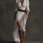Hosszú ujjai és az tartozék öv finoman keretezik a testalkatot, időtlen megjelenést teremtve, amely ideális bármilyen alkalomra: a laza napi programoktól az elegáns eseményekig.