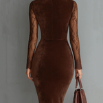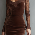 Gioia - Mini Ruha Bársonyból Kulcsnyakú Vintage Stílusban Csipkés Barna Ujjakkal