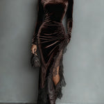Isabella - Maxi Fitted Ruha Csokoládé Bársonyból Aszimmetrikus Csipkével
