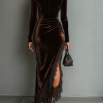 Ez a elegáns csokoládé maxi ruha testhez simuló siluettel rendelkezik, és fényes bársonyból készült. Az aszimmetrikus szegély, amelyet finom csipke díszít, drámai hatást kölcsönöz. A magas nyak és a hosszú ujjak egyensúlyba hozzák merész és szexi stílusát.
