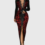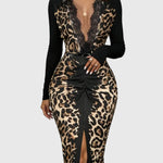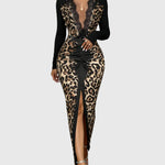 Divatos Mély V-nyakú Leopárd Bodycon Maxi Ruha