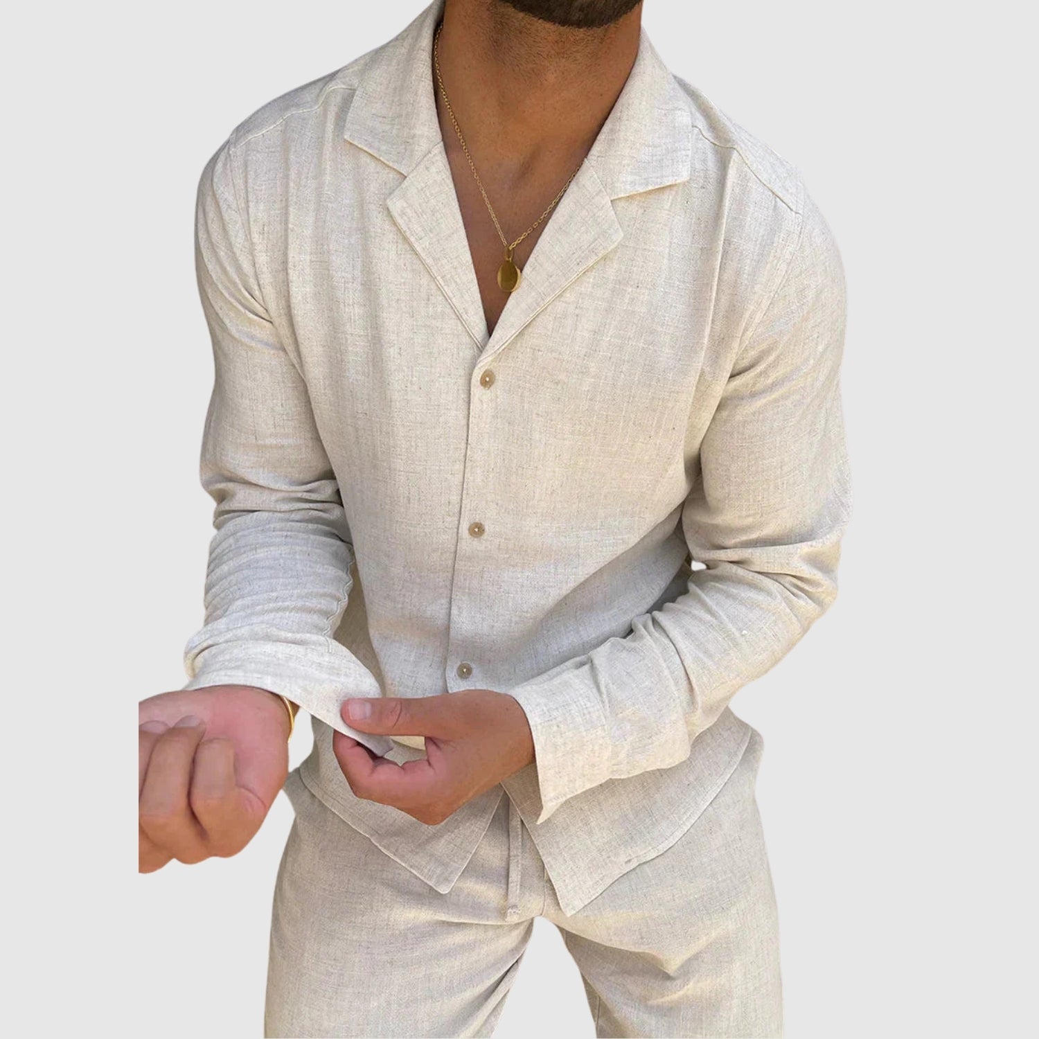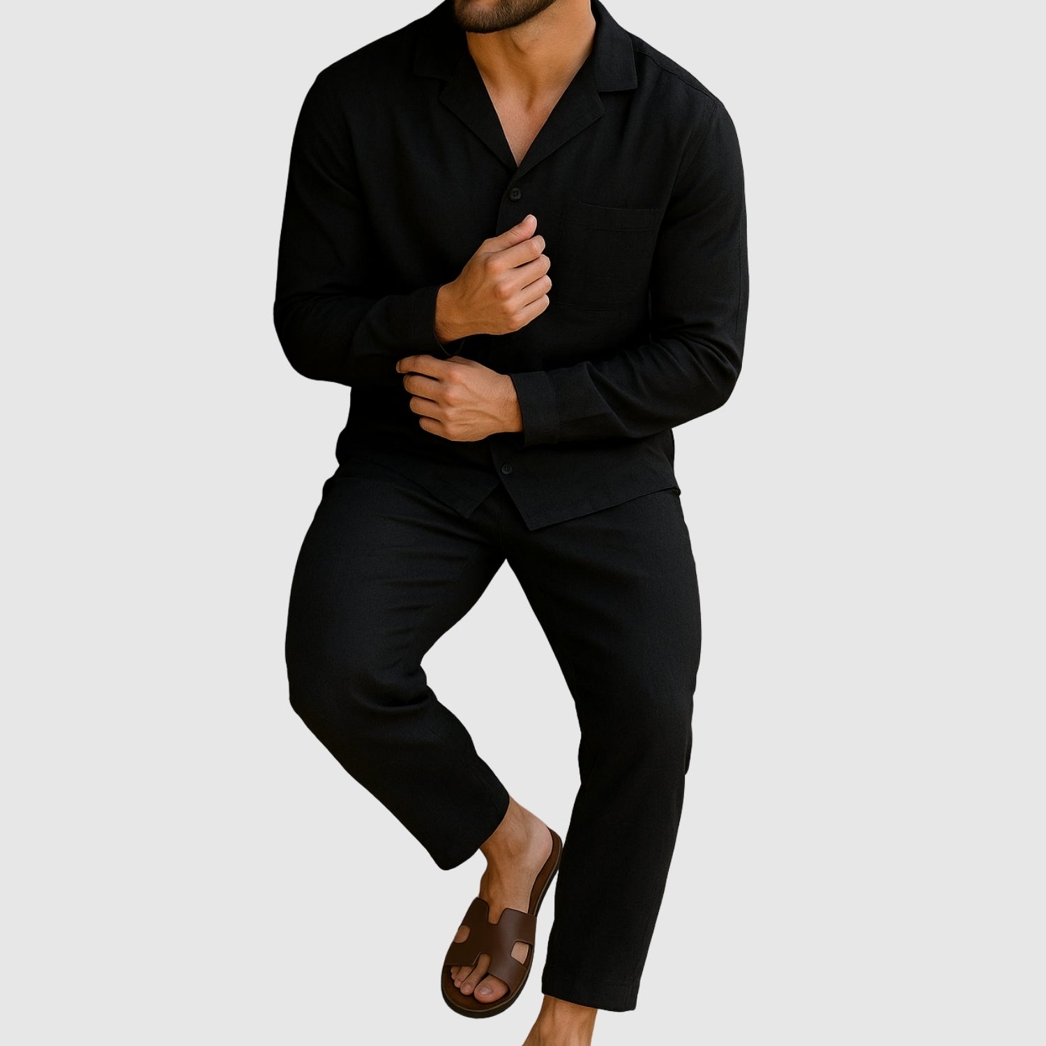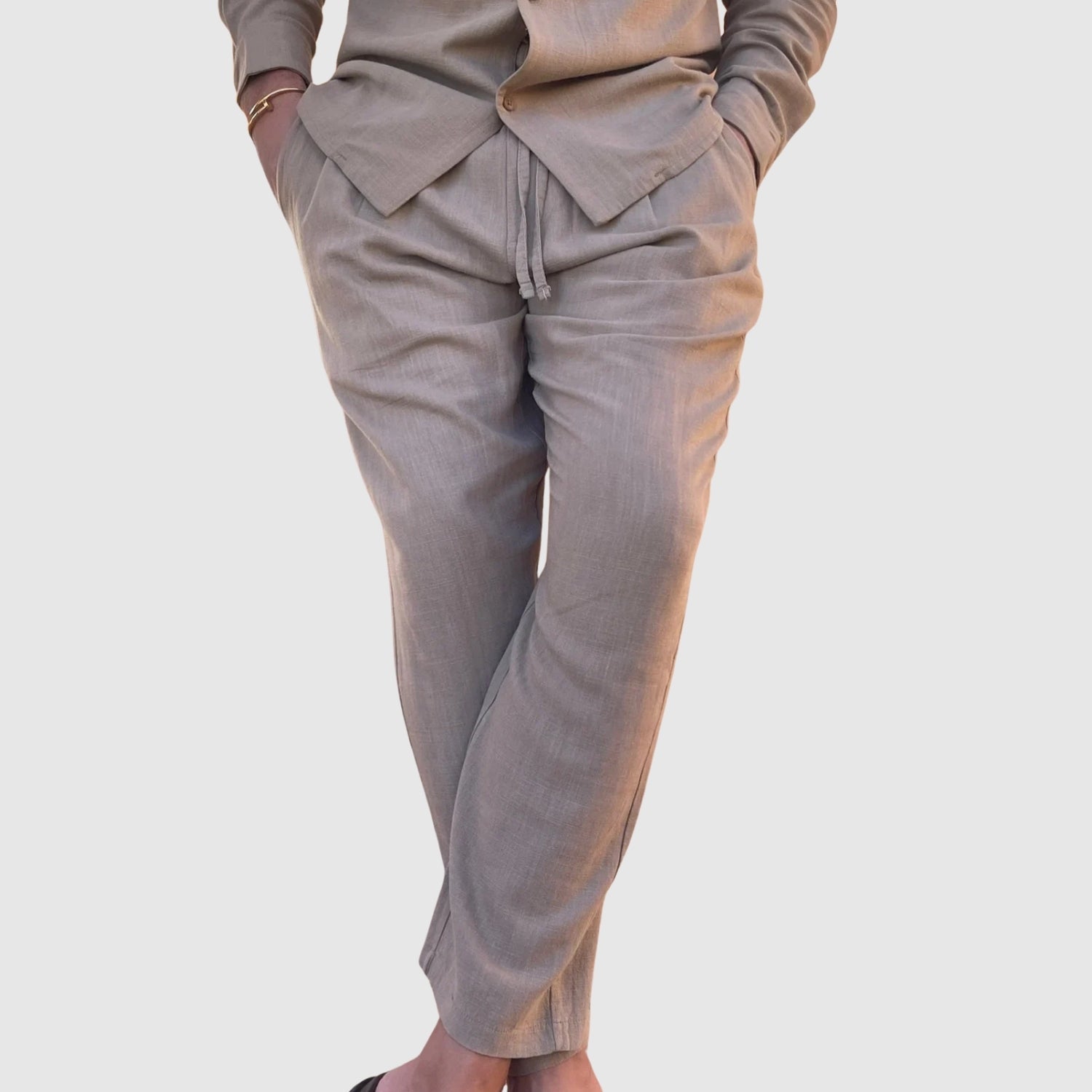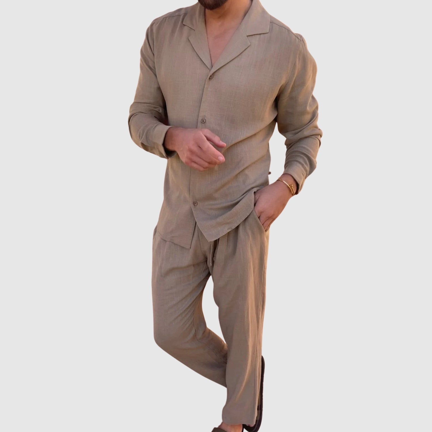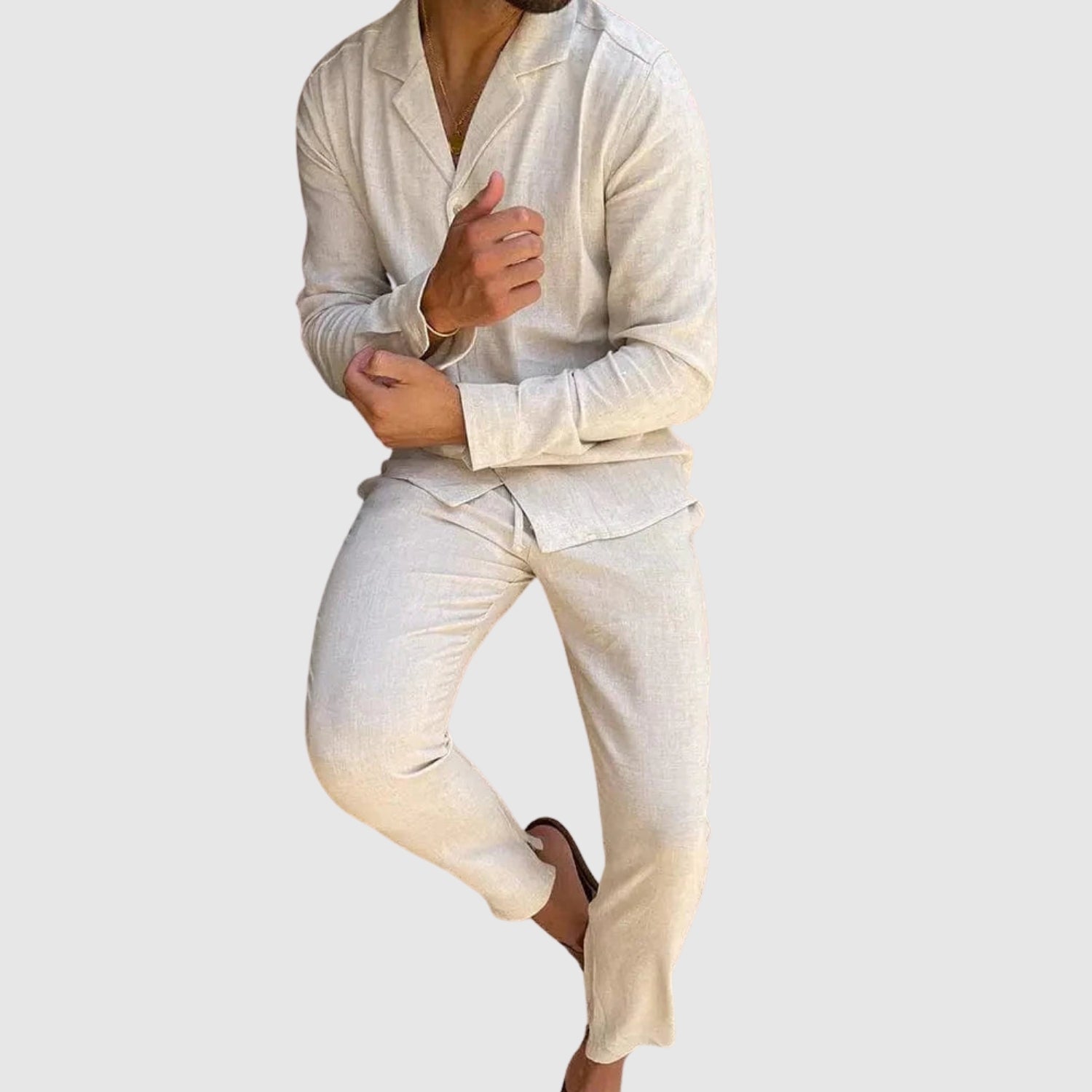 Ez a vászon szett tökéletes kombinációja a kényelemnek és a stílusnak. Könnyű és lélegző anyaga egész nap kényelmesen tart, míg kifinomult dizájnja lehetővé teszi, hogy minden alkalommal tökéletesen nézzen ki, a hétköznapi találkozóktól a különleges eseményekig.