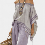 Csíkos bambusz felső, nyitott vállakkal és széles nadrágokkal az elegáns és friss stílusért