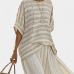 A laza és természetes bájjal rendelkező Daisy szett egy csíkos pólót kombinál, amely puha szabással és laza nadrággal széles övvel rendelkezik. A bambusz vászon anyag frissességet, finom textúrát és mozgást kínál, ideális napos strandnapokra vagy nyugodt városi sétákra.
