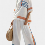Strukturált frissesség tengeri érzéssel. A Daisy szett tiszta és modern dizájnjával tűnik ki, amelyet kézzel készített, élénk színű részletek gazdagítanak. A széles blúz és a széles szárú nadrág lenyűgöző sziluettet alkot, amely könnyedséget és stílust sugároz egyedi karakterrel.