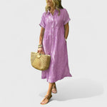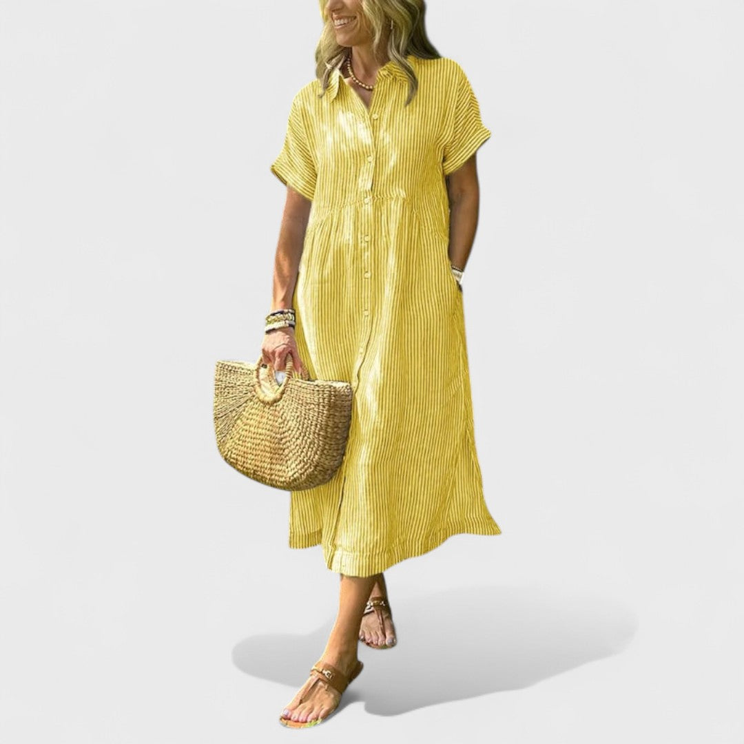 Az Angela ruha hosszabb fazonja és örök klasszikus szabása gyönyörűen kiemeli a derekat, és lágyan körülöleli a testet. Puha, lélegző anyagból készült, ideális forró nyári napokra, romantikus estékhez és ünnepi pillanatokhoz a városban.