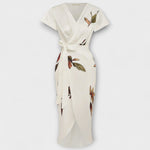 Elbűvölő átlapolós midi ruha élénk levélmintával és kedvező V-nyakkivágással. Ideális bármilyen alkalomra, a brunchoktól a kültéri eseményekig.