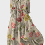 Hosszú ruha földszínekben virágmintával ötvözi a klasszikus eleganciát és a természetes frissességet. A dizájn finoman körülöleli a testet, míg a derékpánt nőies és jól formált sziluettet teremt. Ez a ruha tavaszt és harmóniát hoz minden megjelenésedbe.